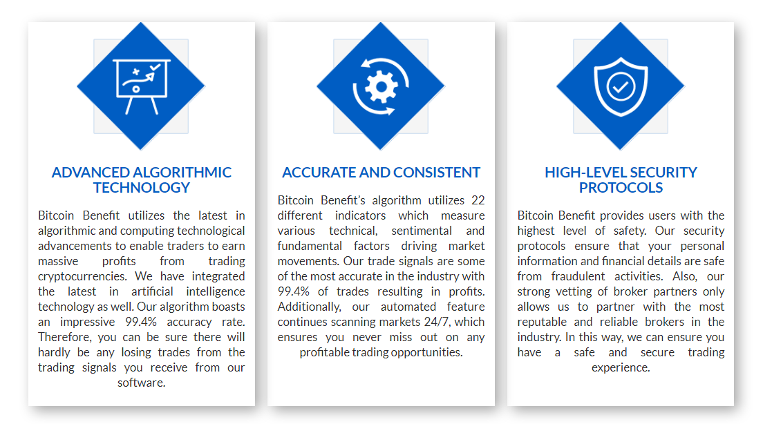 Bitcoin Benefit analyses trading qualitative data. The research includes the news feeds of social media as well as other sources of similar content. Its sophisticated technology is able to distinguish between fake news and true which makes its qualitative analysis an acceptable alternative.