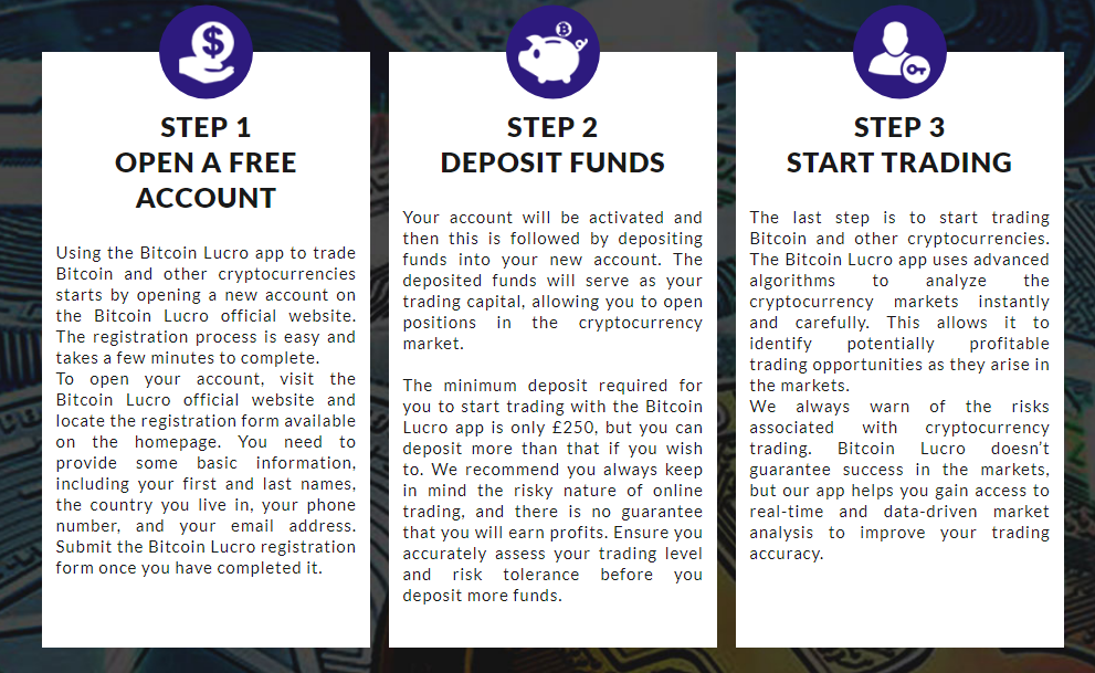 Bitcoin Lucro platform is a unique cryptocurrency trading platform that is designed to give new and experienced traders the opportunity to make steady profits in a market that is volatile. To fully benefit from the numerous advantages offered by this platform, users need to fund their accounts by investing at least EUR250. With this amount in your trading account, you can start your cryptocurrency trading experience by trading Bitcoin as well as other cryptocurrencies with Bitcoin Lucro.