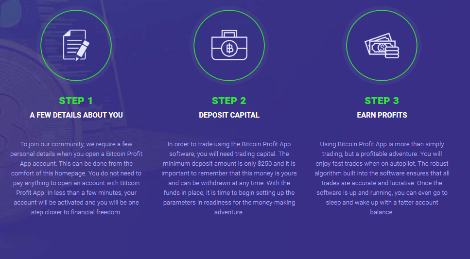 To trade with Bitcoin Profit users must first deposit $250. The money is used as capital for trades. It isn’t necessary to invest all your funds in one transaction You can begin with just $25 per trade, and gradually increase the amount of money you invest.
