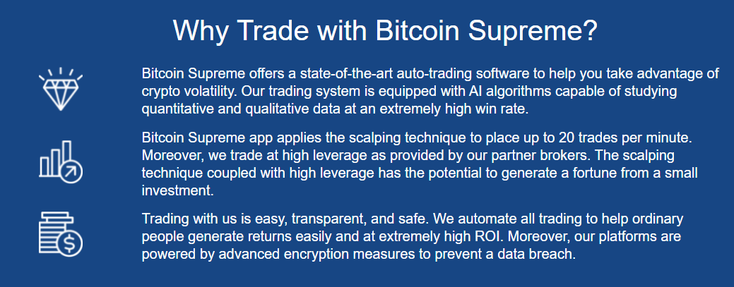 Bitcoin Supreme promises to be an excellent option to earn money online and still be safe. We strongly suggest that you evaluate your risk tolerance and only invest what you are able to lose with no negative financial consequences.