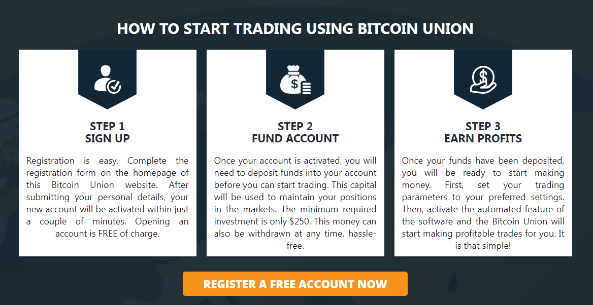 The process of creating an account for a brand new Bitcoin Union account is a relatively simple and easy procedure. This is a process that requires only a few minutes. The automated trading robots are not able to take any information from clients that are not needed. It protects customer data with the utmost professionalism and security. It basically requests basic data from the user like: