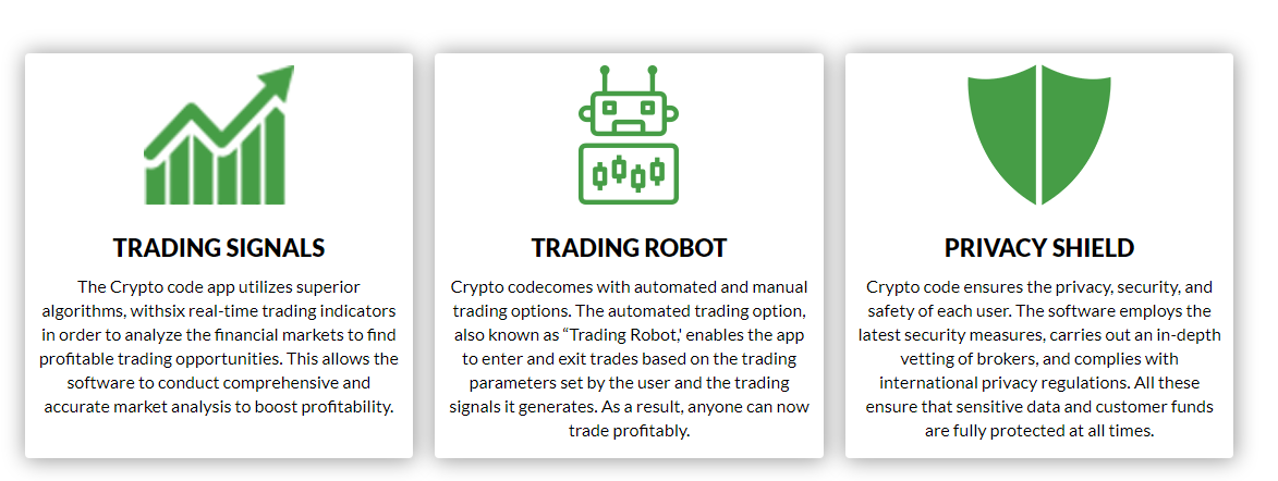 Crypto Code is one of the most dependable and oldest trading software available as per reviews and testimonials on the internet This means that a significant amount of effort went into its development, which is not like most of the robots that are available in the market today. Crypto Code Crypto Code software outperformed our expectations in terms of the speed of analyzing and gathering market information. Furthermore, Crypto Code completely takes control of trading, leaving the user with plenty of time.