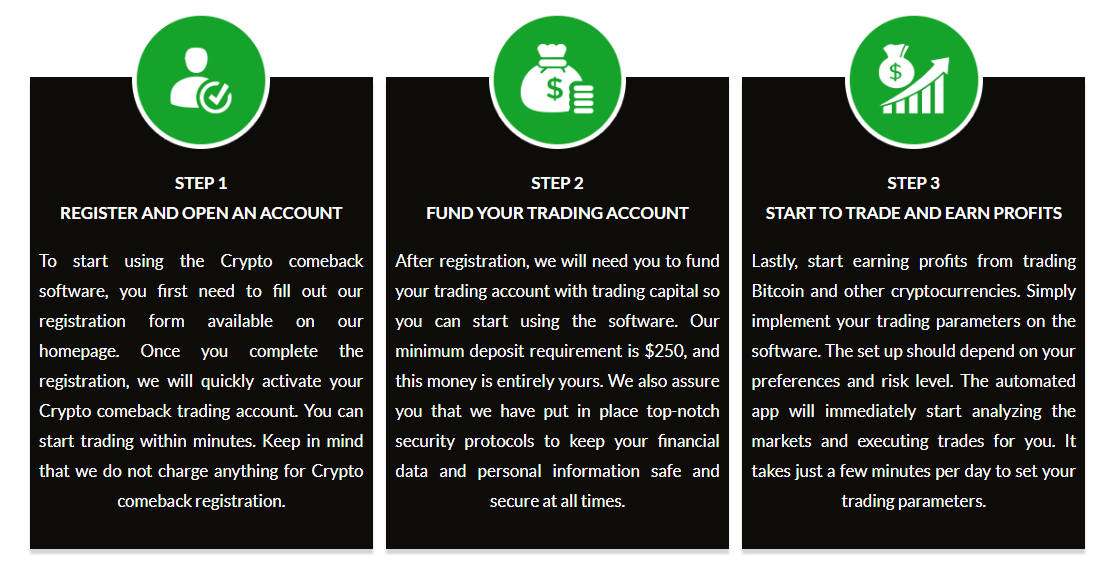 Crypto Comeback Pro is an auto trading platform that helps traders decide on the most appropriate time to make a trade. This robot has been designed with advanced algorithms to trade the crypto market, and its unpredictable nature. It makes its decisions using its AI program. The machine decodes the information and analyzes it to precisely forecast the direction in which the market is going. It identifies the most profitable trades and helps traders make use of the information to gain profits on the trading.
