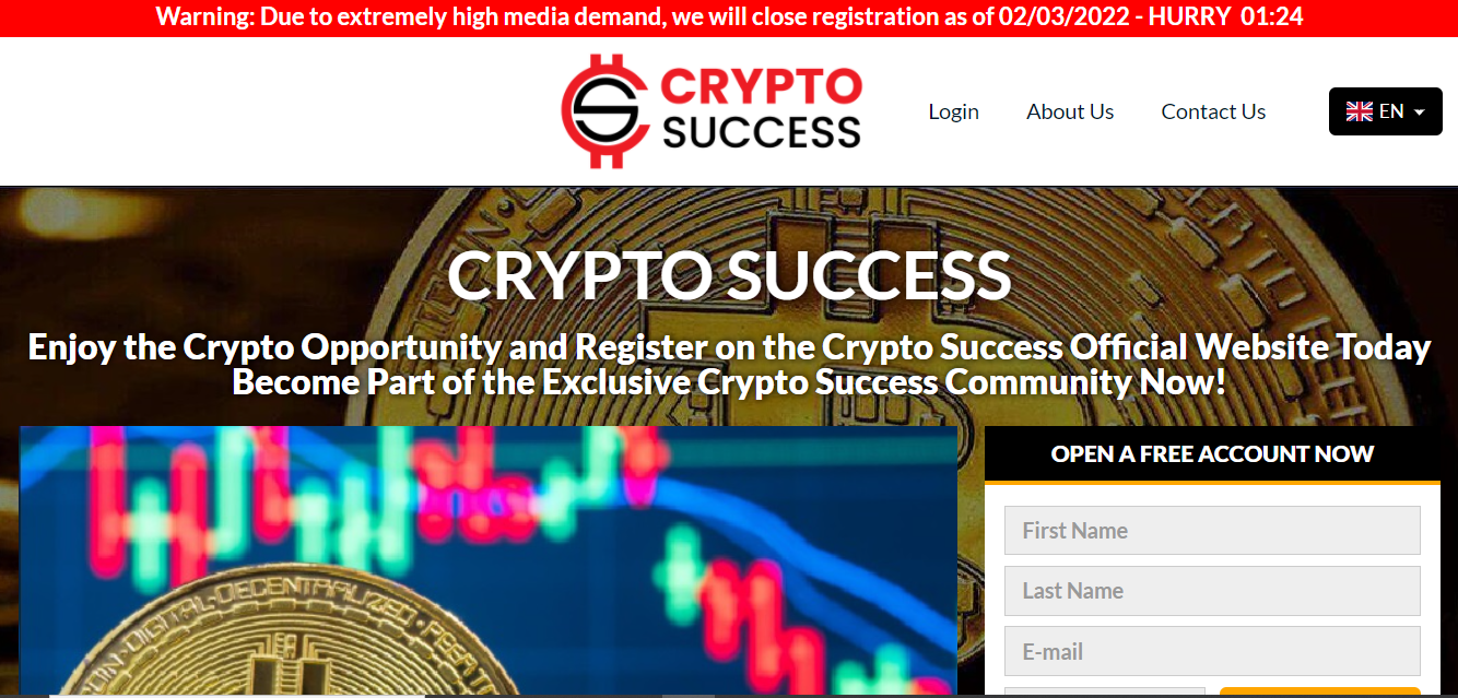 Crypto Success is an automated trading system that assists investors in obtaining trading signals and determining the best time to invest. The software uses AI and machine learning to evaluate the cryptocurrency market and provide the optimal entry and exit points for cryptocurrency trading. The right signal can be obtained by users, but the procedure is arduous and time-consuming, whereas the robot claims to be 0.01 seconds ahead of the market and uses this information to profit from the fluctuating bitcoin market.