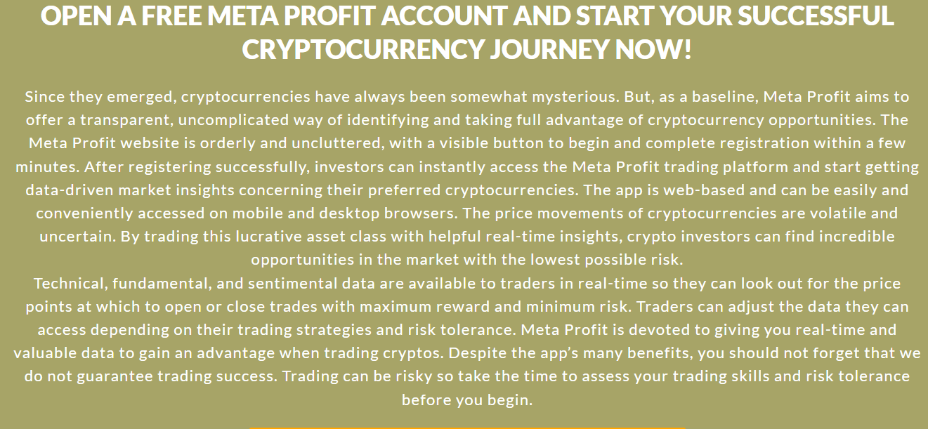 Meta Profit, according to its creators, is a cryptocurrency trading platform that allows traders to invest in cryptocurrencies without having any prior experience dealing in cryptocurrencies or any knowledge of these digital assets. To begin investing, simply create an account on the platform and deposit funds. After that, the investment procedure can start.